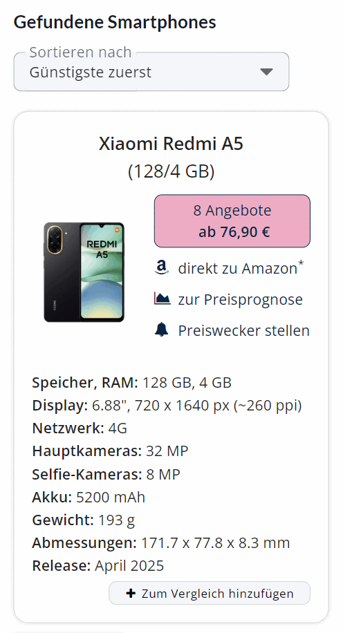 Nutzt du unseren Finder hingegen am Smartphone, so bekommst du dieselben Treffer als kompakte Karten angezeigt, die du einzeln durchgehen und nach Neuheit oder Preis sortieren kannst.