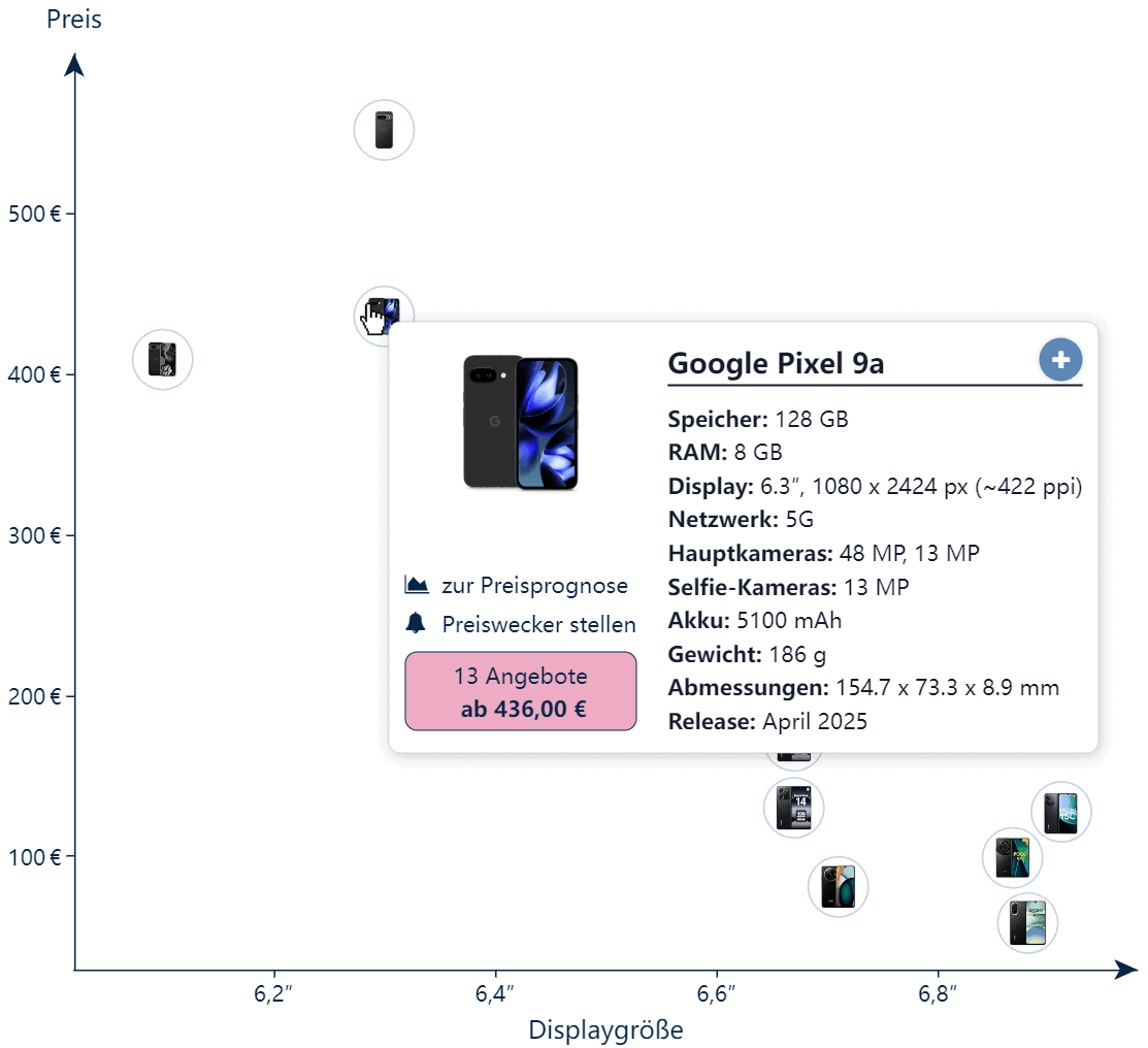 Nutzt du unserer Finder am Desktop-Computer, siehst du deine Treffer in einem interaktiven Diagramm: Standardmäßig ordnen wir die Modelle nach Displaygröße (x-Achse) und Preis (y-Achse). So hast du direkt eine Übersicht über alle passenden Modelle und kannst deinen persönlichen Preis‑Leistungs‑Schnapper sichten. Über das Dropdown-Menü oberhalb der Achsen kannst du alternativ auch ppi oder Gewicht zum Sortieren wählen. Um mehr über ein einzelnes Smartphone zu erfahren, fahre einfach mit deiner Maus über das gewünschte Smartphone.
